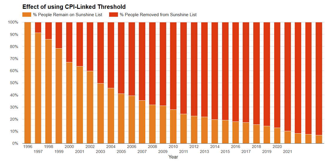 Incomes have steadily fallen, not just nominal incomes but also inflation adjusted incomes have declined tremendously. In 1996 the infamous Sunshine List was developed in Ontario. The list still reports people earning a nominal income that exceeds $100,000 – but that 1996 $100,000 is only worth $54,000 today. After properly adjusting for inflation the list should require only people earning about $190,000 be listed.